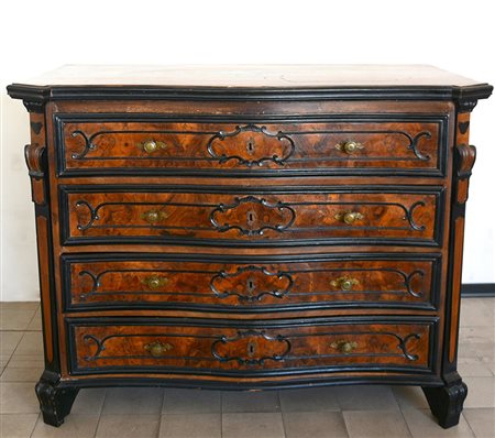 Antico canterano in noce di forma mossa a quattro cassetti radicati e decorati da volute ebanizzate. Montanti decorati da fregi scolpiti (cm 143x110x68) (difetti)
