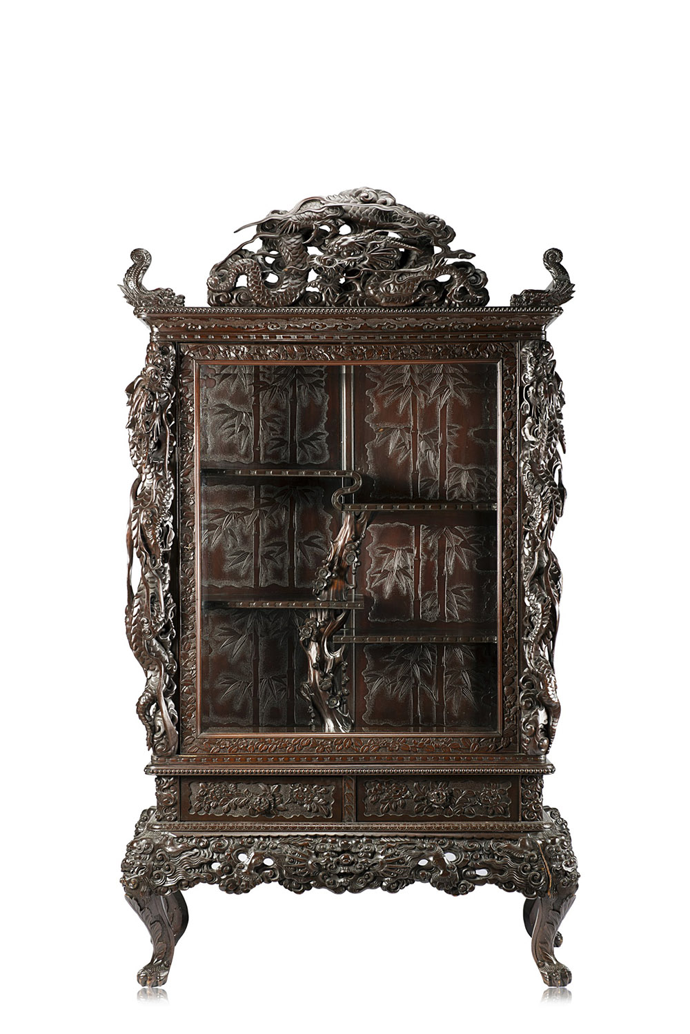 Grande mobile in legno riccamente intagliato con draghi e motivi floreali, l’interno con mensole asimmetriche, anta in vetro, con due cassetti (difetti e mancanze) Giappone, periodo Meiji (1868-1912) (212x120x53 cm.)