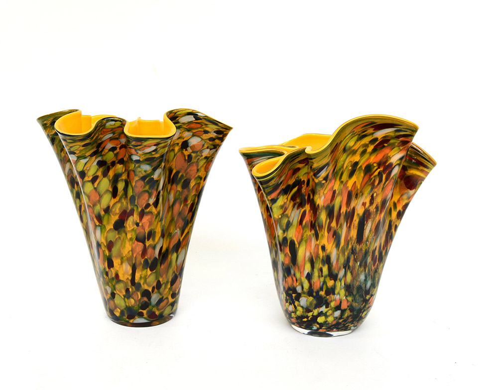 Coppia di vasi a fazzoletto in vetro decorato a murrine, misure diverse