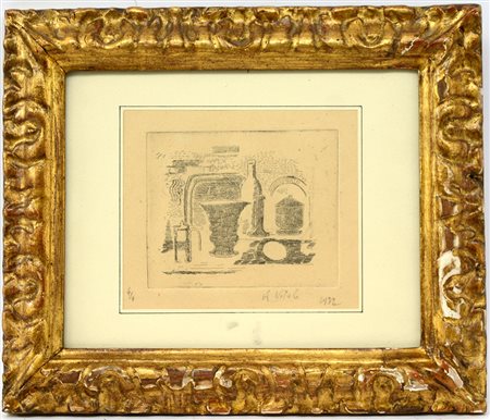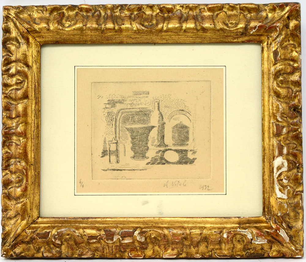 Alberto Vitali Bergamo 1898 1974 "Composizione 1932" incisione (cm foglio 13,8x16,2) firmata e numerata 4/4 in lapis. In cornice dorata