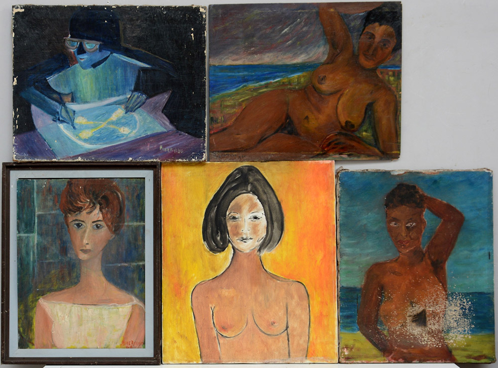 Primo Minervino Lotto composto da cinque dipinti di tecniche, misure e soggetto diverso, alcuni firmati (difetti e mancanze)