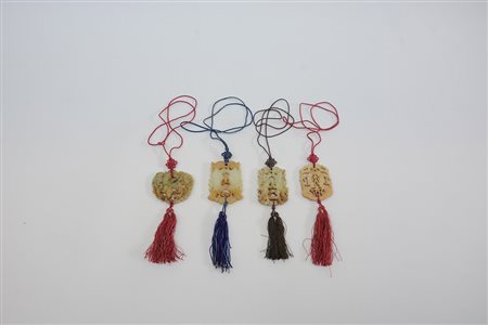 Quattro intagli in giada con creature fantastiche e ceste di fiori Cina, sec. XX (h. max. 6 cm.)