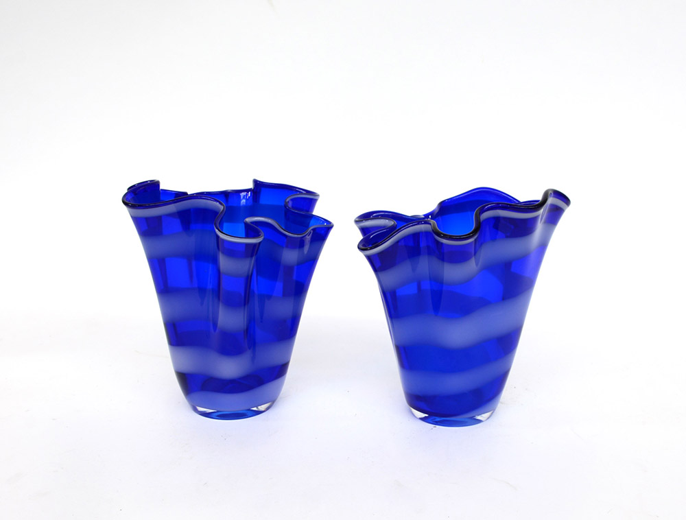 Coppia di vasi a fazzoletto in vetro blu decorato a striature (h cm 21,5 ca)