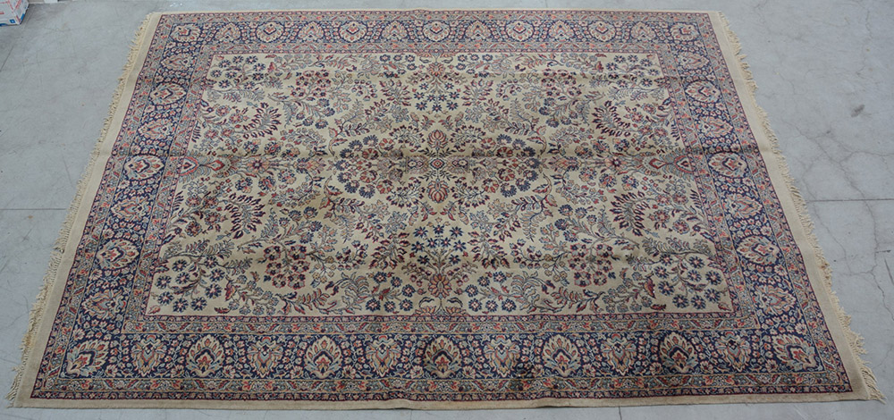 Tappeto meccanico a decoro orientale a motivi floreali su fondo beige (cm 353x260) (difetti)