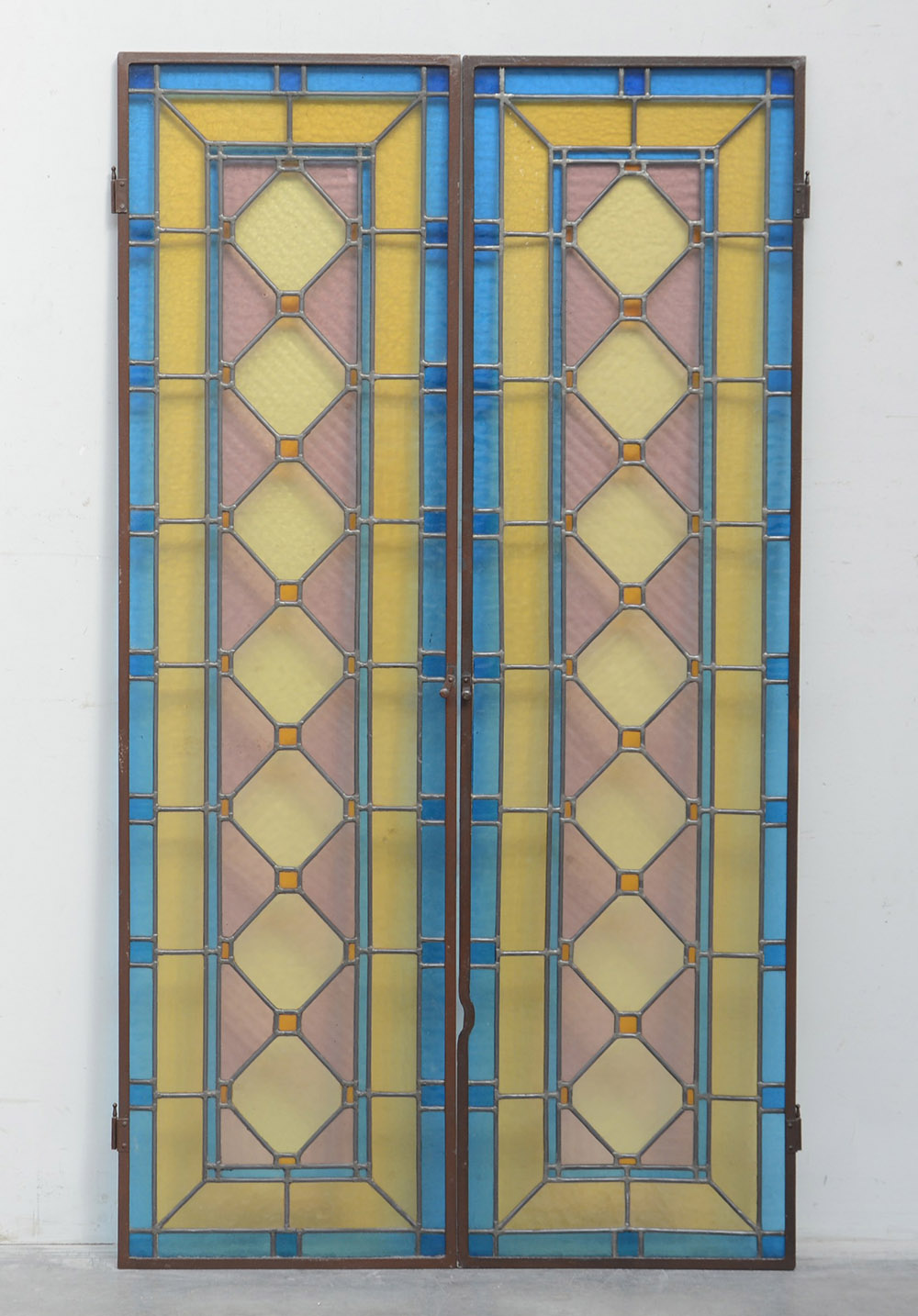 Coppia di vetrate rettangolari con vetri policromi legati al piombo (cm 154x43 cad) (difetti)