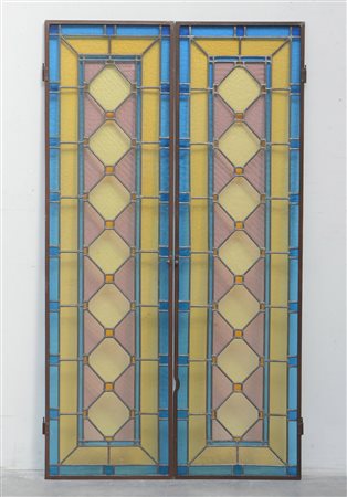 Coppia di vetrate rettangolari con vetri policromi legati al piombo (cm...