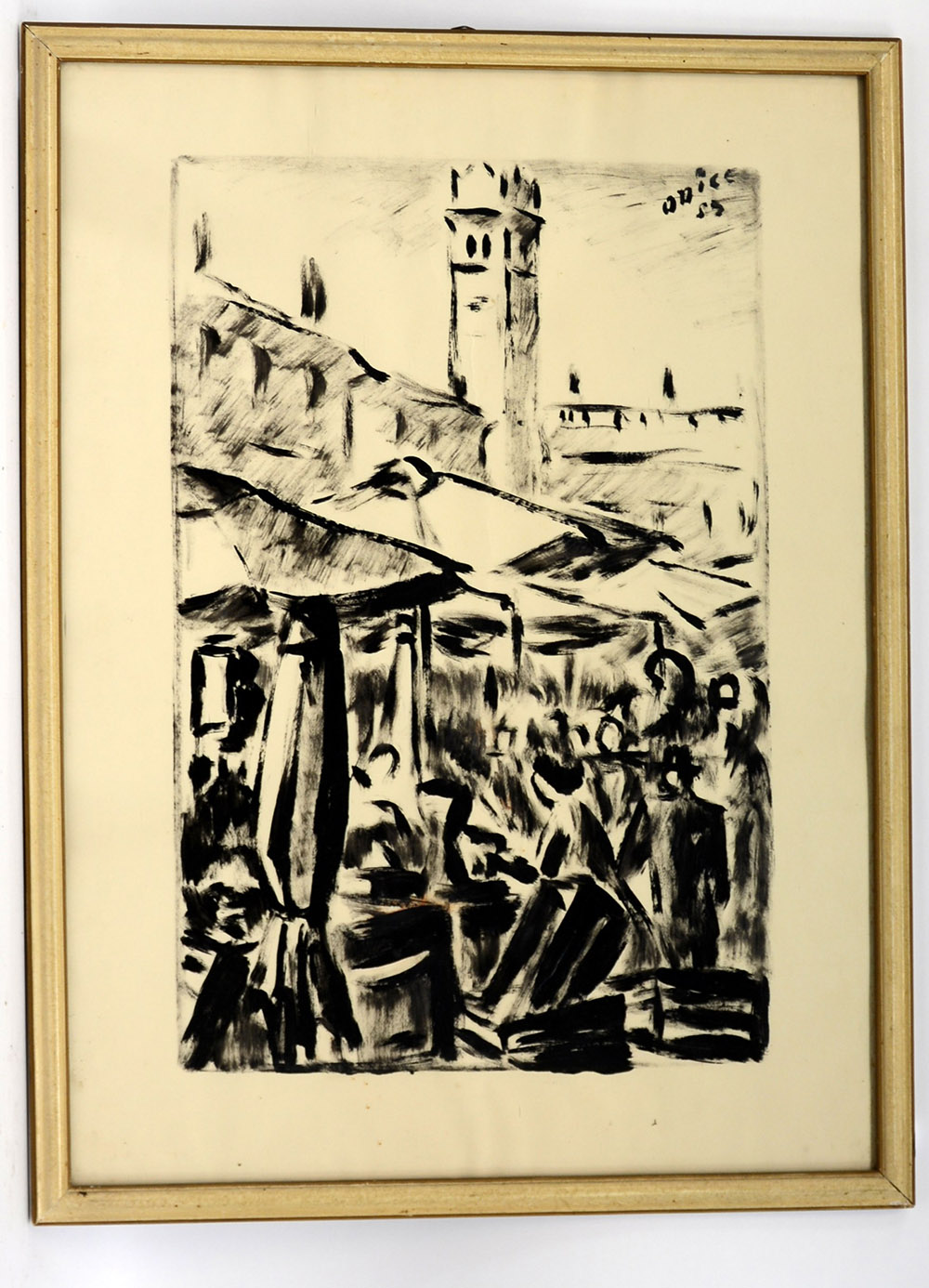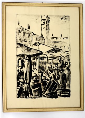Firma indecifrata, "Il mercato", tecnica mista su carta (cm 65x48) firmato e datato in alto a destra, in cornice (difetti)
