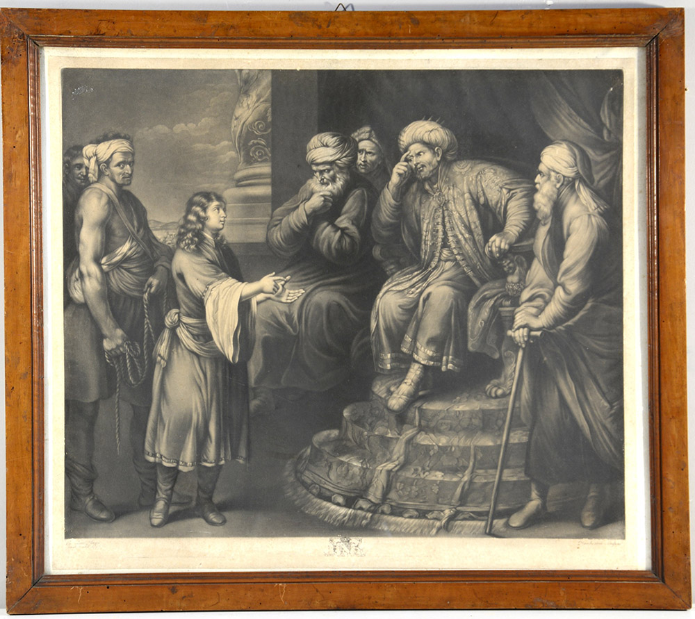 Antica stampa raffigurante scena biblica (cm 55x63). In cornice (difetti)