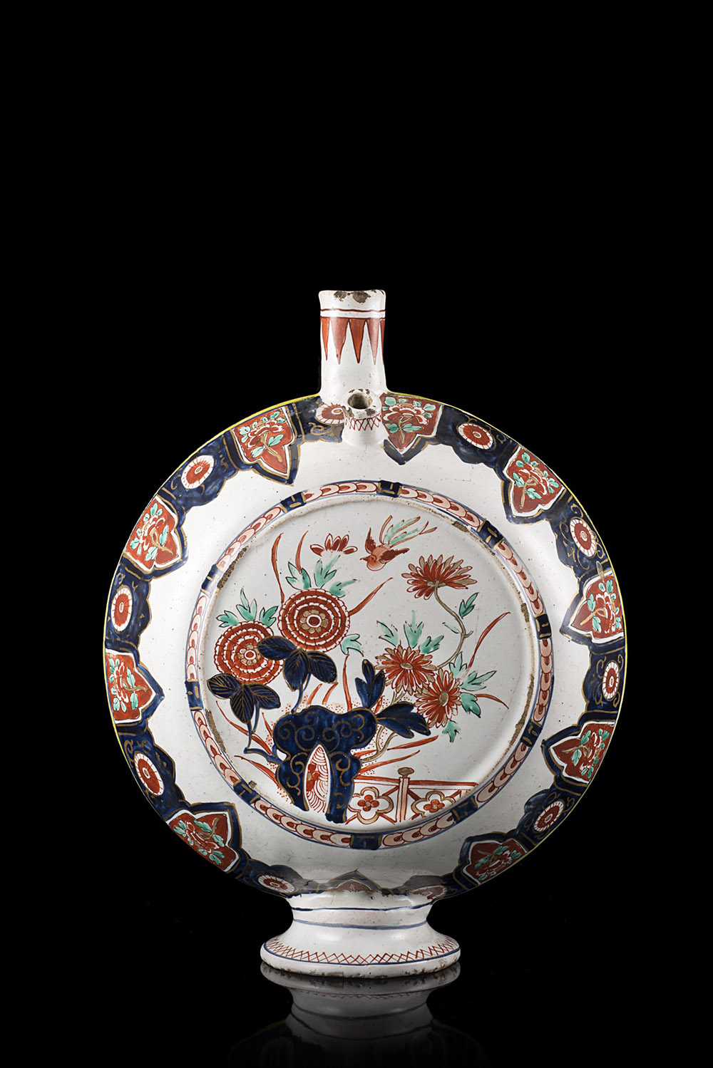 Fiasca ‘alla turca’ in maiolica decorata con motivi decorativi policromi medio-orientali ed al centro da fiori e roccia di gusto orientale. Rialzi in oro. Siglata nella fascia. Manifattura di Delft sec. XIX (h. cm 26,5) (mancanze e rotture)