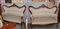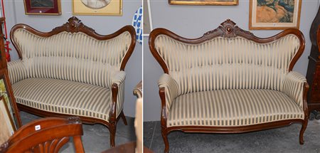 Coppia di divanetti a due posti in legno intagliato con schienale mosso e...