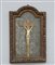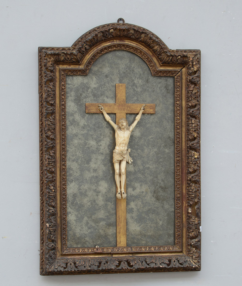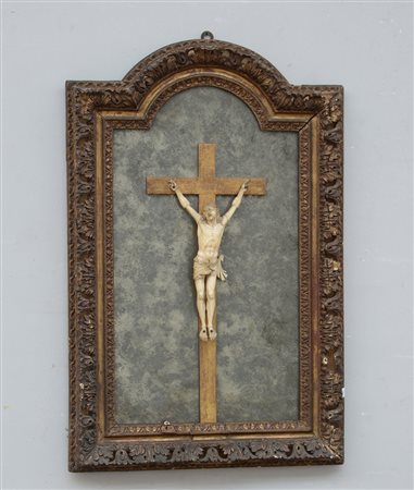 Arte del sec. XVIII. Cristo crocifisso in avorio scolpito applicato in cornice antica in legno intagliato e traforato decorato a motivi vegetali (difetti)