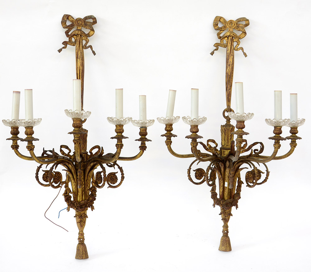 Coppia di appliques a cinque fiamme in metallo dorato con braccia sagomate, fusto decorato a festoni floreali e fiocco nella cimasa (h cm 88)