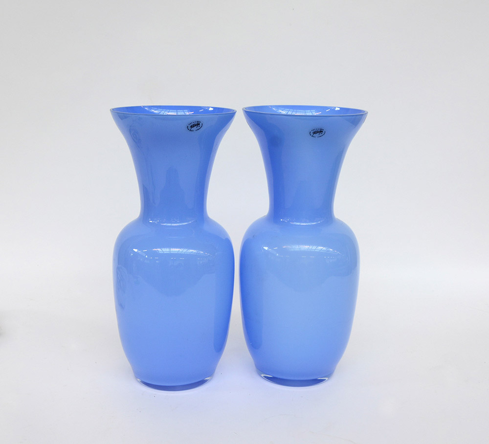 Coppia di vasi a balaustro in vetro opacizzato celeste (h cm 35)