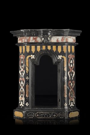 Tabernacolo di struttura architettonica in marmo nero del Belgio con fascia e montanti intarsiati in madreperla e marmi vari a volute, campanule e fiori. Sec. XVIII (cm 46x56x20) (difetti e mancanze)
