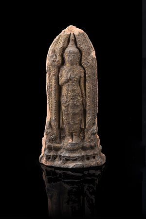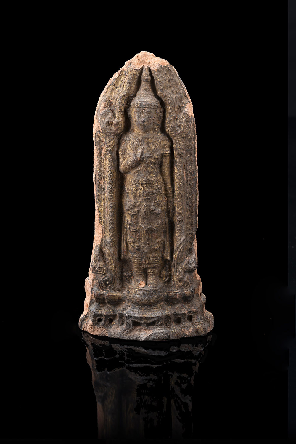 Arte birmana sec. XIX. Parte di fregio in terracotta dorata raffigurante una divinità (h. cm 21) (difetti e mancanze)