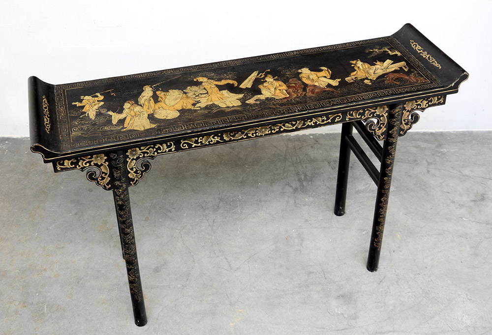 Altare da parete in legno laccato nero con dorature. Piano con bordi rialzati decorato con immortali (lievi difetti) Cina, sec. XX (142x87x40 cm.)