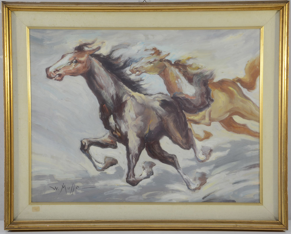 Musso W. "Cavalli" tecnica mista su masonite (cm 43x58) firmato in basso a sinistra e iscritto al retro, in cornice