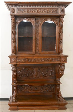 Mobile a due corpi in rovere. Parte superiore con due ante a vetro con fasce intagliate a raffaellesche, parte inferiore ad un cassetto ed una mensola con montanti sagomati ed intagliati a figure alate (cm 110x200x53)