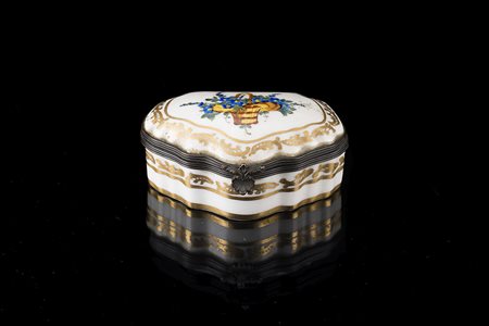 Manifattura di Sèvres inizio sec. XIX. Scatola in porcellana decorata nel coperchio a cesto con fiori. Fascia e bordura a volute dorate (cm 8x4x5,5)