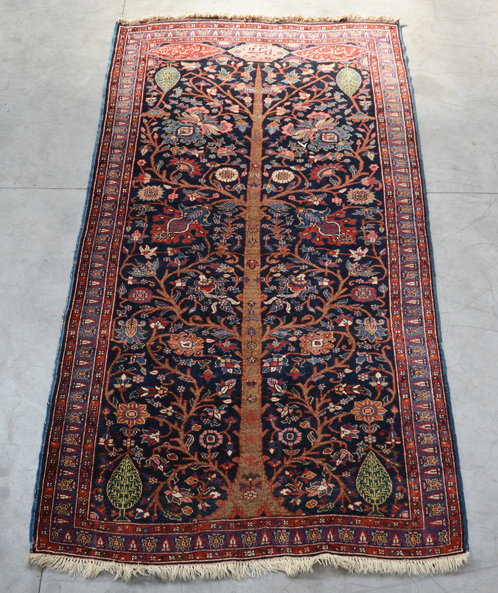 Tappeto Bidjar, Persia inizio sec. XX. Disegno con albero della vita centrale ricco di rami fioriti e foglie piumate in policromia su fondo blu. Quattro cipressi alle testate. Sopra l'albero tre cartigli con date e iscrizioni in lingua araba (cm 314x157) (difetti)