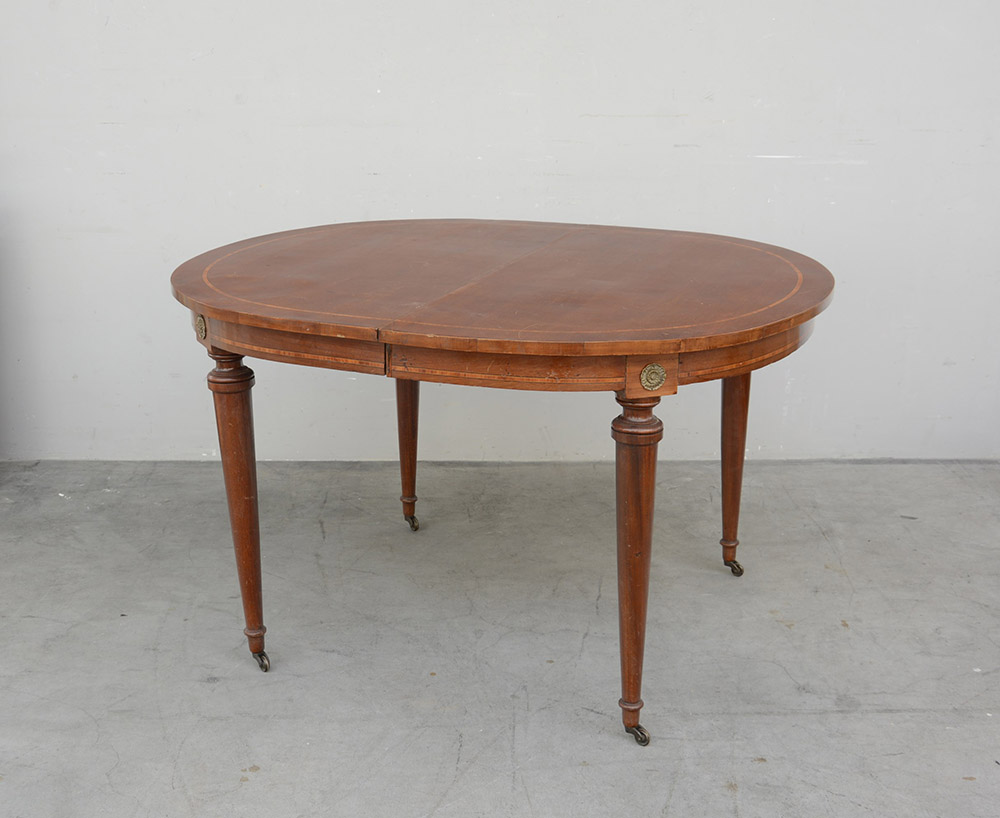 Tavolo ovale allungabile in mogano con piano e fascia filettata. Gambe tornite terminanti con rotelle. Fine sec. XIX (cm 130x78x116)(difetti)