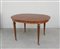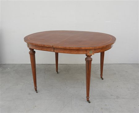 Tavolo ovale allungabile in mogano con piano e fascia filettata. Gambe...