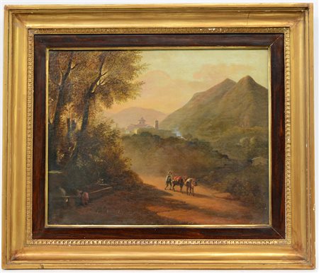 Maestro del XIX Secolo "Paesaggio con pastore e paese sullo sfondo" olio su tela (cm 39x48) In cornice (difetti e restauri) Allegato certificato su fotografia rilasciato dal dott. Dino Bonardi che attribuisce il dipinto a Pietro Ronzoni