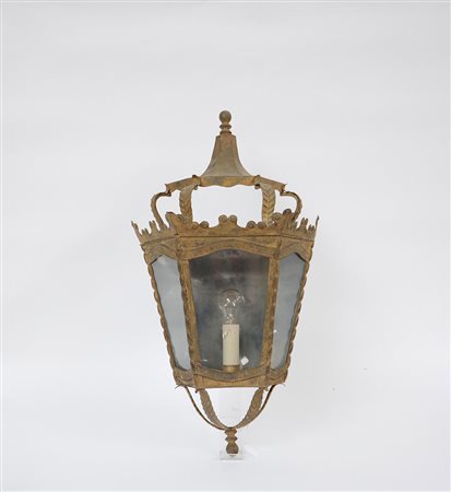 Applique da esterno a una luce in lamiera di ferro verniciato in oro con sommità coronata e vetri di protezione (cm 43x78x22) (difetti)