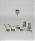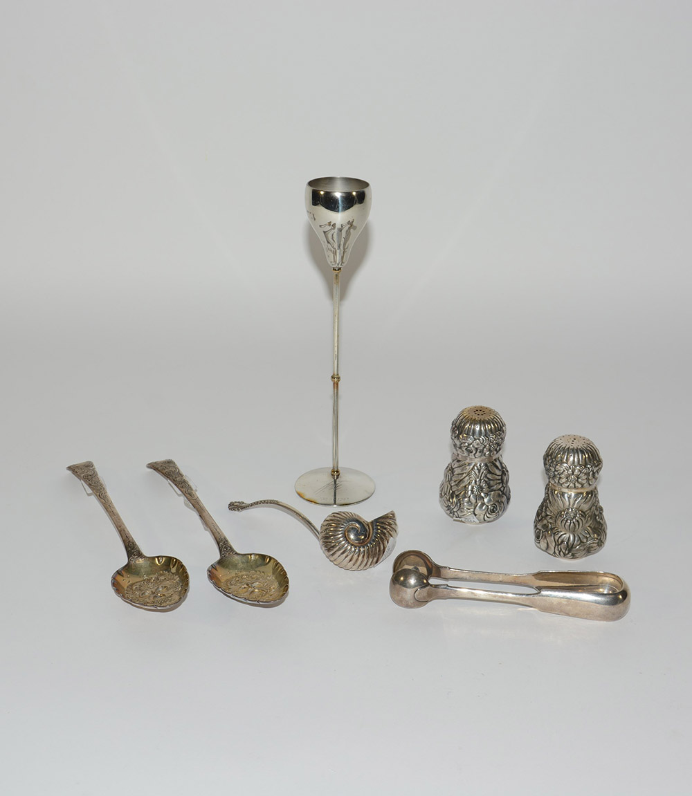 Lotto composto da due saliere con punzoni russi e due cucchiai, un colino, una pinza e vasetto con punzoni inglesi arg. 800/925. (gr 380)