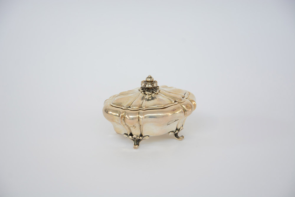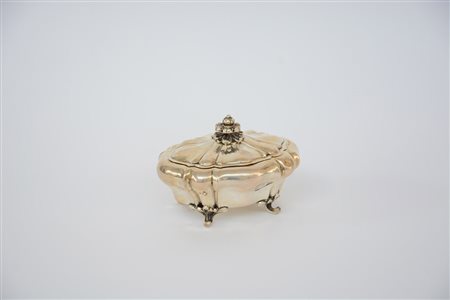 Scatola in argento con coperchio, di foma ovale baccellata e costolata con quattro piedini a voluta fogliata, pomolo floreale. Italia, sec. XX (cm 14x10xh. cm18) (gr 340 ca.) (difetti)