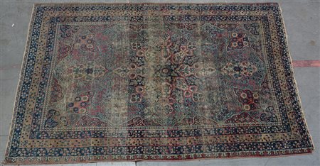 Tappeto Kirman, Persia sec. XX. Disegno a medaglione su fondo azzurro (cm 261x171) (gravi difetti)