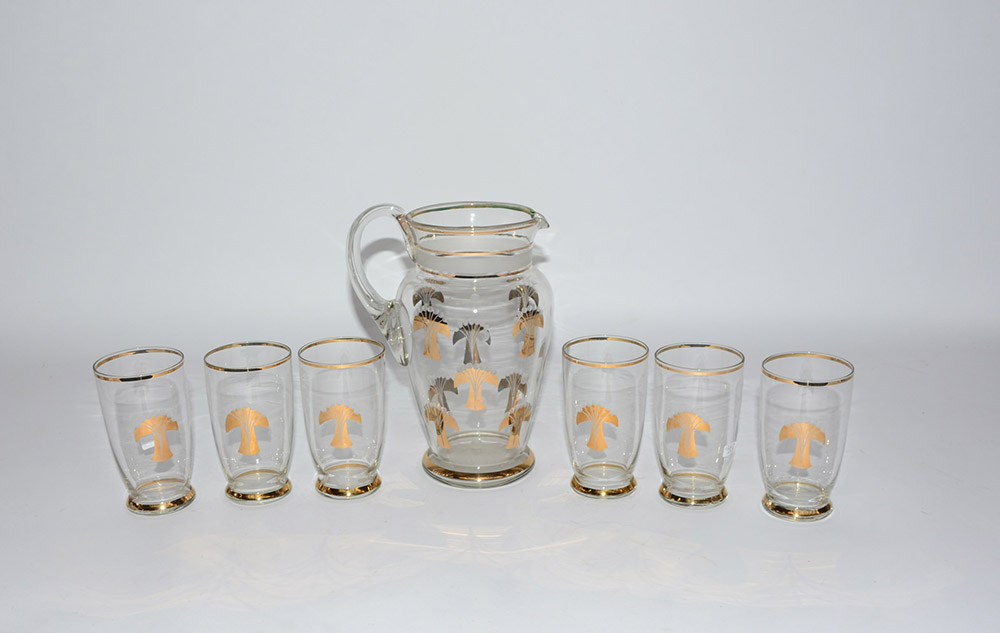 Brocca con sei bicchieri in vetro decorato in oro a motivi vegetali (difetti)