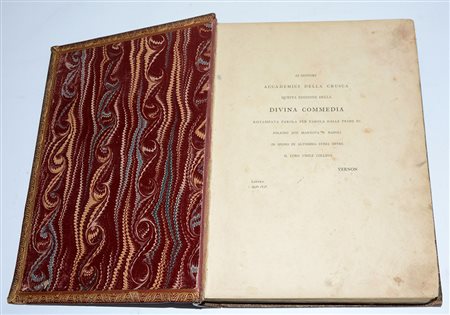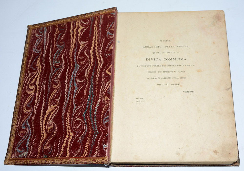 Dante Alighieri. Divina Commedia. Londra: Carlo Whittingham, [1858]. Legatura in marocchino rosso coeva (difetti e mancanze iniziali).