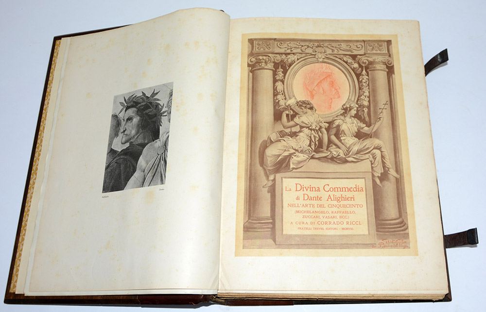 Dante Alighieri. Divina Commedia. Fratelli Treves, 1908. Legatura coeva in mezza pelle, piatti in legno, placca artistica sul piatto, fermagli.