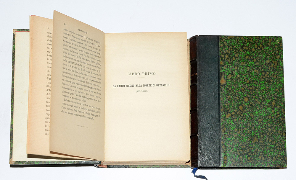 Lotto composto da due pubblicazioni di Pasquale Villari: Le invasioni barbariche in Italia (Milano, 1905; II edizione); L'Italia da Carlo Magno alla morte di Arrigo XVII (Milano, 1910). Rilegati in mezza pelle con piatti marmorizzati (difetti).