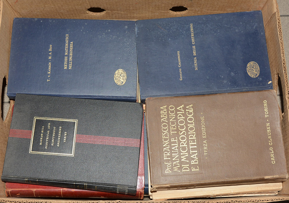 Cartone contenente volumi di argomento scientifico, fra cui ad esempio "Il manuale tecnico di microscopia e batteriologia" del Prof. Abba (lievi difetti).