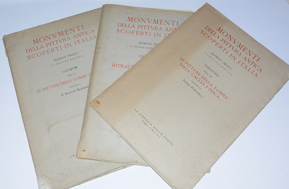 I monumenti della pittura antica scoperti in Italia. 11 volumi pubblicati tra il 1937 e il 1942 che includono "Le pitture delle tombe delle leonesse e dei vasi dipinti"; "Le pitture della tomba della caccia e pesca"; "Le pitture delle tombe arcaiche"; "Ritratti di età ellenistica"; Le pitture della Casa dei Grifi"; "Le pitture dell'Aula Isiaca di Caligola"; "Le pitture della Casa di Livia"; "Le pitture del colombario di Villa Pamphili"; "Le pitture della Casa del Citarista"; "Le pitture delle case di M.F. Fabius Amandio e del Sacerdos Amandus e di Cornelius Teges; "Le pitture del tempio di Iside. Monumentale opera sulle antiche pitture edita in varie annate nelle officine dell ŽIstituto Poligrafico dello Stato in 501 esemplari su carta Nettunia a mano di cui 301 numerati da 1 a 301 ESEMPLARE n. 180. Folio grande. Legatura originale in brossura (difetti).