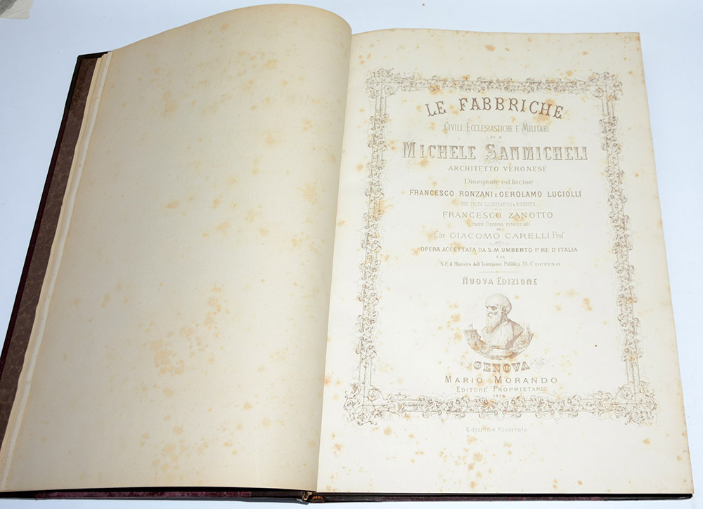 Sanmicheli, Michele. Le fabbriche civili, ecclesiastiche e militari. Genova: presso Mario Morando, 1879. Legatura posteriore in mezzapelle. Folio grande.