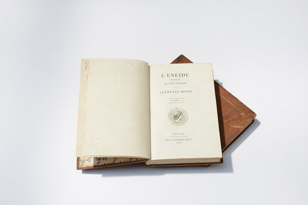 L'Eneide tradotta in versi italiani da Clemente Biondi. Parma: Stamperia Reale, 1790-93. Due volumi in 8vo. Legatura in piena pelle con decorazioni in oro.