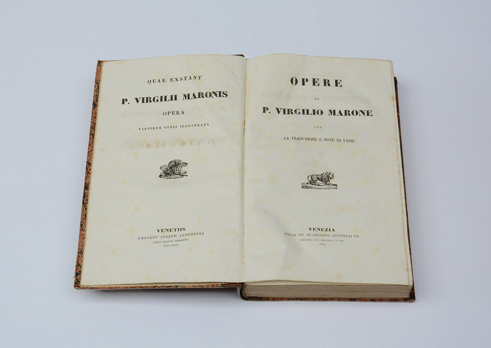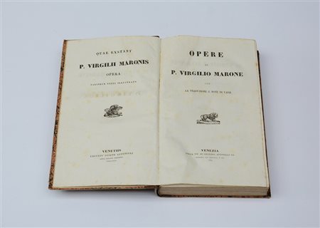 Opere di P. Virgilio Marone. Venezia: Tipografia di Giuseppe Antonelli Editore, 1839. Volume in 4to. Legatura in mezza pelle e piatti marmorizzati.