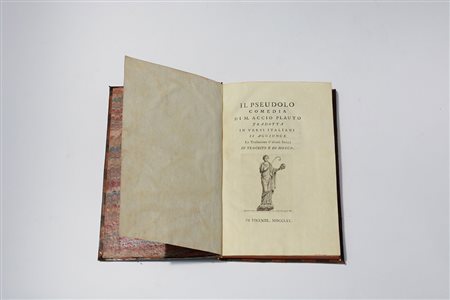 Il Pseudolo Comedia di M. Accio Plauto...La Traduzione d'alcuni Idillj di Teocrito e di Mosco. Firenze: [s.n.], 1765. Volume in 8vo, con bellissima incisione al frontespizio. Legatura in piena pelle, taglio rosso.