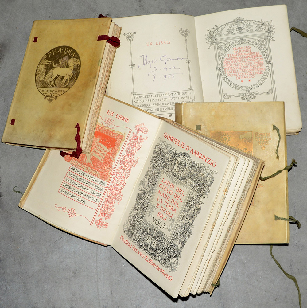Lotto composto dalle seguenti opere di Gabriele D'Annunzio, edite dai Fratelli Treves: Francesca da Rimini (1902); Delle Laudi (in due volumi, 1903-1904); Fedra (1909). Legature editoriali in piena pergamena coeva decorata in oro.