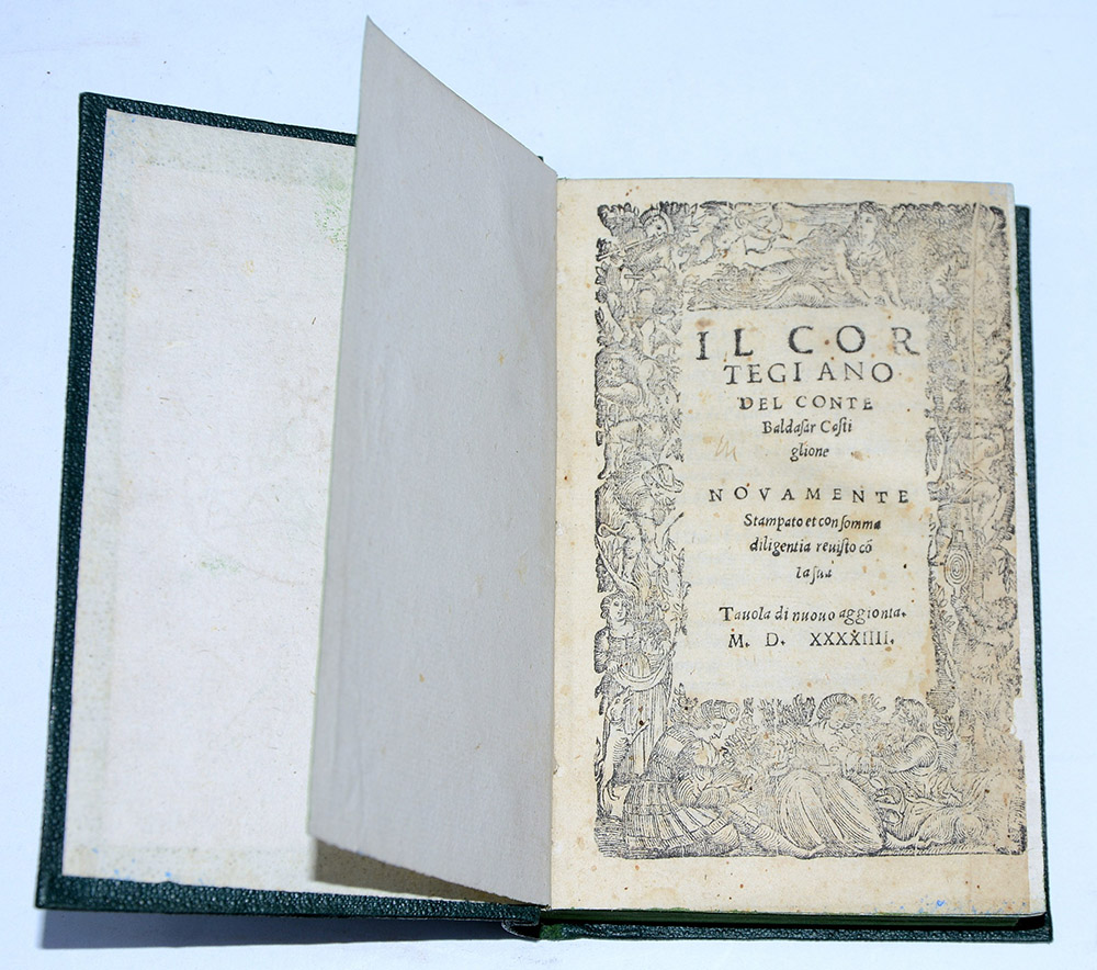 Il libro del cortegiano del conte Baldesar Castiglione. Venezia: Alvise de Tortis, 1544. Frontespizio xilografato. Legatura moderna in tela, taglio verde (lievi difetti).