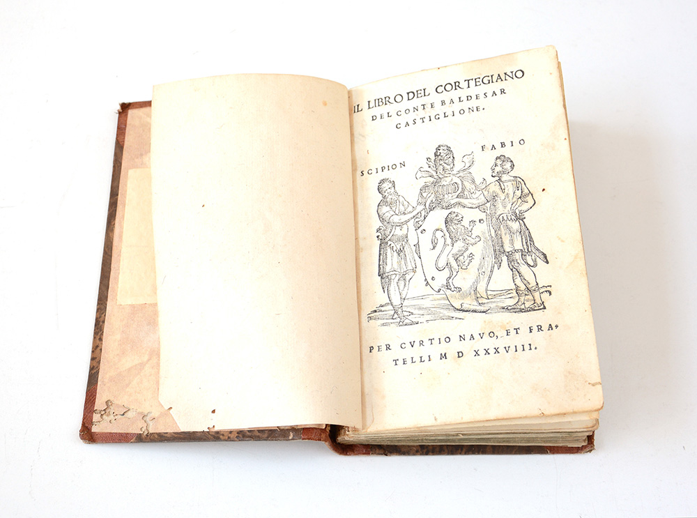 Il libro del cortegiano del conte Baldesar Castiglione. [Venezia]: Curzio Navo e fratelli, 1538. Bella marca marca sul frontespizio e in fine. Legatura moderna in mezza pelle e piatti cartonati, taglio azzurro (lievi difetti).
