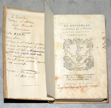 In epistolas Ciceronis ad Atticum, Pauli Manutii Commentarius. Venezia: Paolo Manuzio, 1547. Marca tipografica al frontespizio. Legatura moderna in piena pergamena (lievi difetti).