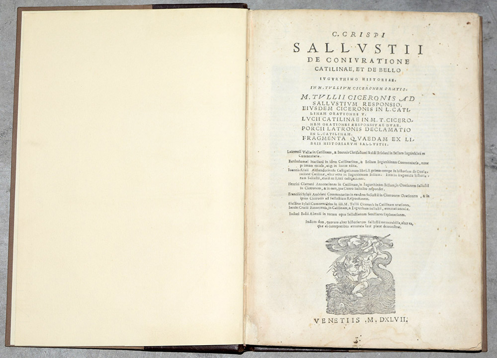 C. Crispi Sallustii De Coniuratione Catilinae et De Bello Iugurthino Historiae. Venezia: in aedibus Venturini Roffinelli, 1547. Marca tipografica al frontespizione e svariate xilografie. Legatura moderna in mezza pelle.