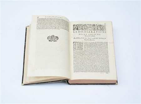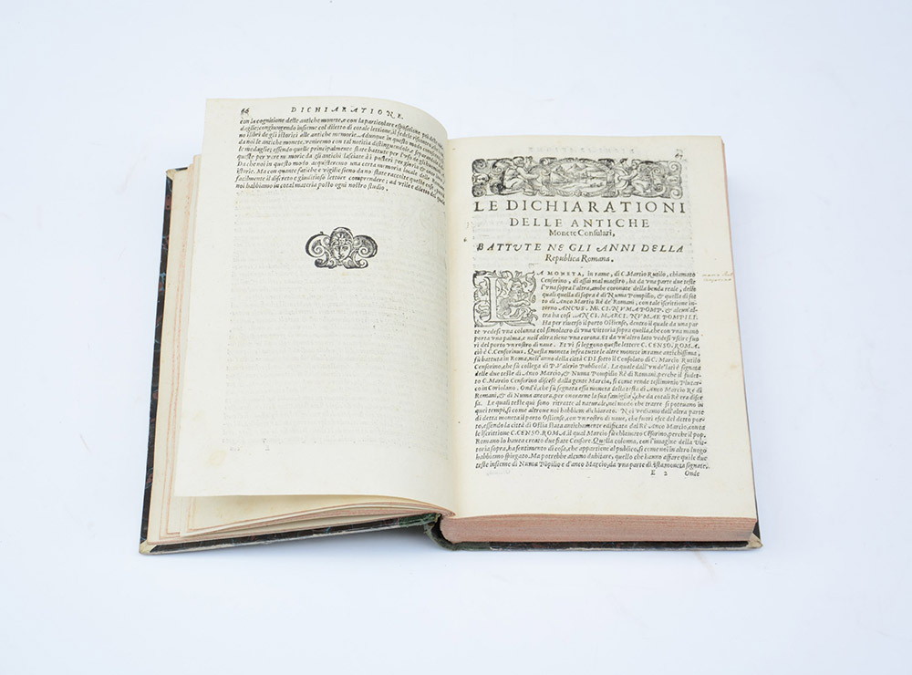 Discorso di M. Sebastiano Erizzo. Sopra le medaglie degli Antichi. Venezia: Giovanni Varisco e Paganino Paganini, 1585. Volume in 4to. Bel frontespizio xilografato, iniziali e fregi xilografati. Legatura in mezza pelle e piatti marmorizzati, taglio a spruzzo rosso (lievi difetti).