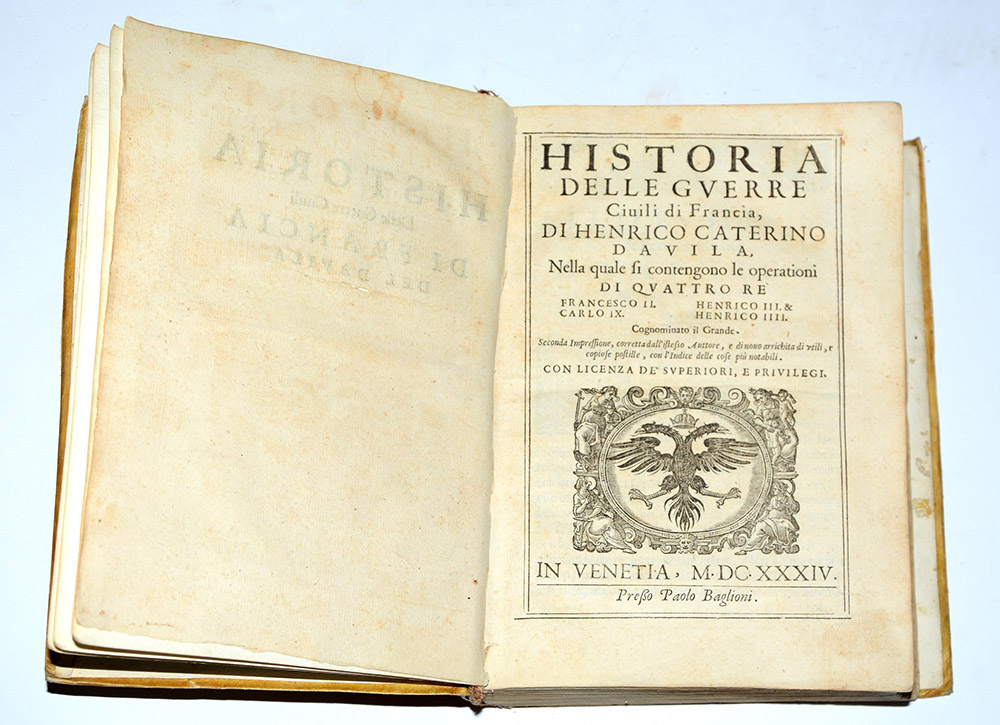 E. Caterino Davila. Historia delle guerre civili di Francia. Venezia: Paolo Baglioni, 1634. Marca tipografica al frontespizio e alcuni capilettera finemente xilografati. Legatura coeva in piena pergamena con autore e titolo manoscritto al dorso (difetti).