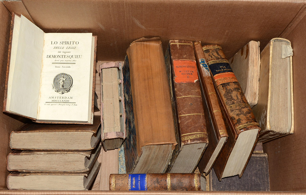 Cartone contenente svariati libri relativi alla giurisprudenza, di diversa epoca (lievi difetti).