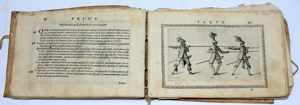 PISTOFILO, Bonaventura. Oplomachia. Siena: Hercole Gori, 1621. Prima ed unica edizione di uno dei più pregiati trattati di scherma. Molto raro, ma mancante di alcune carte e incisioni. 4to oblungo (132 x 198mm). Frontespizio in cornice decorativa e due ritratti incisi su rame, con 37 in stato abbastanza buono e una decina rovinate. Legatura coeva in vitello floscio. Provenienza: Angelo ?Zannello (iscrizione datata 1663; regalato a:) -- iscrizione illeggibile datata 1675.